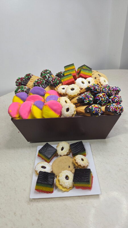 • Rainbow Cookies (8) – almond-flavored layers with raspberry jam and smooth chocolate coating.