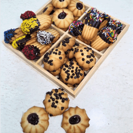 • Round Jelly Cookies (8) – golden shortbread rounds layered with fruit jelly for the perfect bite of sweetness.